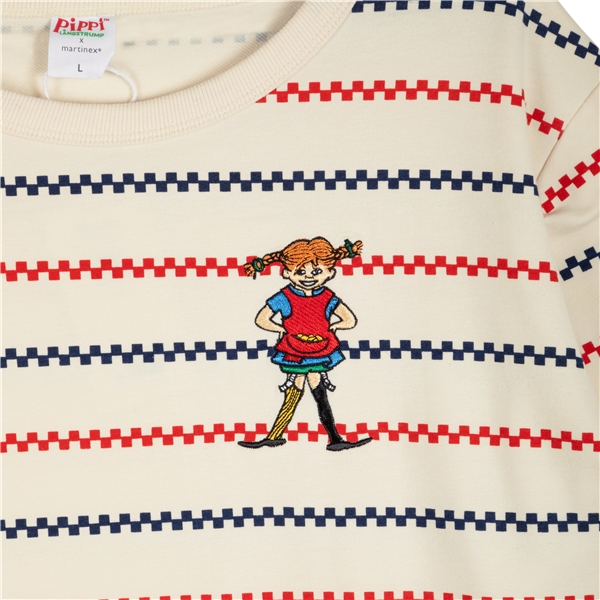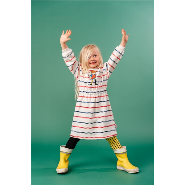 En mjuk och mysig Pippi Långstrump collegeklänning för barn. Lång ärm med lätt nedhasad axelsöm, muddar i ärmsluten, rund halsringning, fina röda och blå ränder mot det benvita, samt ett färgglatt Pippi-tryck framtill. Klänningen är avskuren med infälld resår och rynk i midjan. Produkten innehåller certifierad ekologisk bomull.