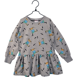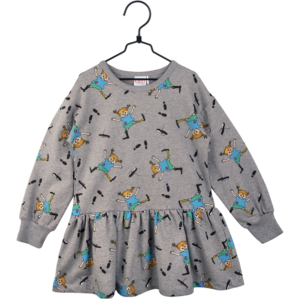 Pippi Steg Collegeklänning Grå är en fin, grå klänning med lång ärm, rund halsringning och volangkant nertill. Klänningen är prydd av tryck med glada Pippi-figurer och hennes skor och skospår.