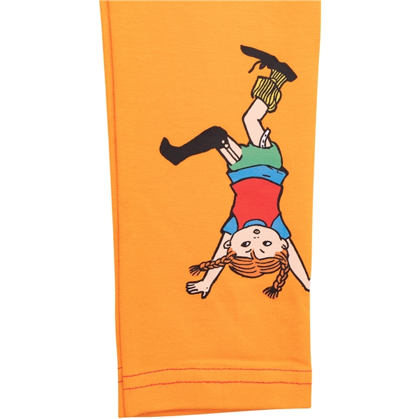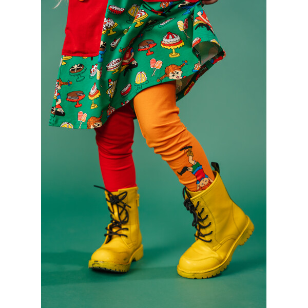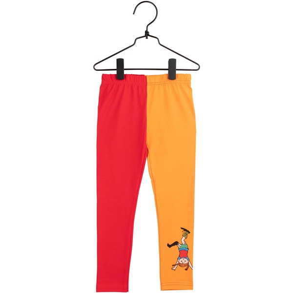 Pippi Leggings Röd/Orange är härligt färgglada, mjuka leggings i rött och orange. På ena benet är det ett Pippi-tryck där hon står på händerna.