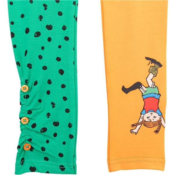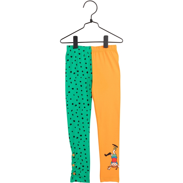 Pippi Prick Leggings Grön är mjuka leggings i bomull. Ena benet är grönt med svarta prickar och påsydda knappar längst ner på benet som en fin detalj. Andra benet är orange med ett lekfullt Pippi-motiv längst ner på benet där hon står på händerna.