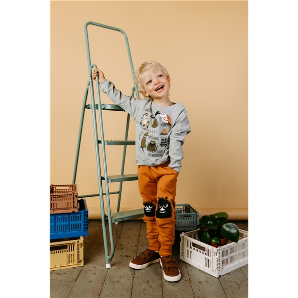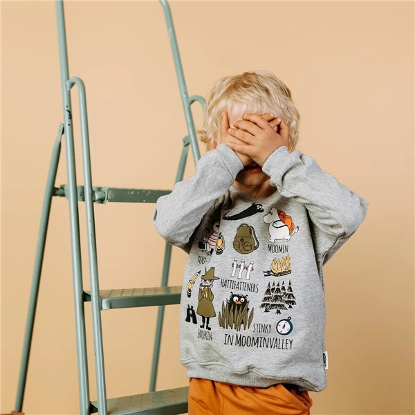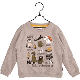 Mumin Collegetröja Grå är en mjuk och bekväm Mumintröja i oversize. Tröjan har en rund halsringning och ett tryckt mönster med olika muminkaraktärer i ett campingtema.