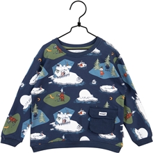 En långärmad, mörkblå tröja i mjuk sweatshirtkvalitet med borstad insida. Modellen är lätt oversized och tröjan är härligt helmönstrad med muminfigurer på spännande äventyr bland isflak och öar. Halsringningen och muddarna i ärmslut och nederkant är blå det finns en kul ficka i tröjans nederkant.