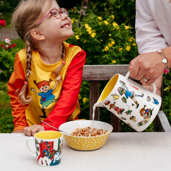 Glada Pippi Tröja Gul är en färgglad, lekfull Pippi tröja med långa ärmar och rund halsringning. Tröjan är orange, röd och gul har ett Pippi-tryck framtill.