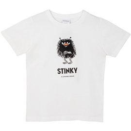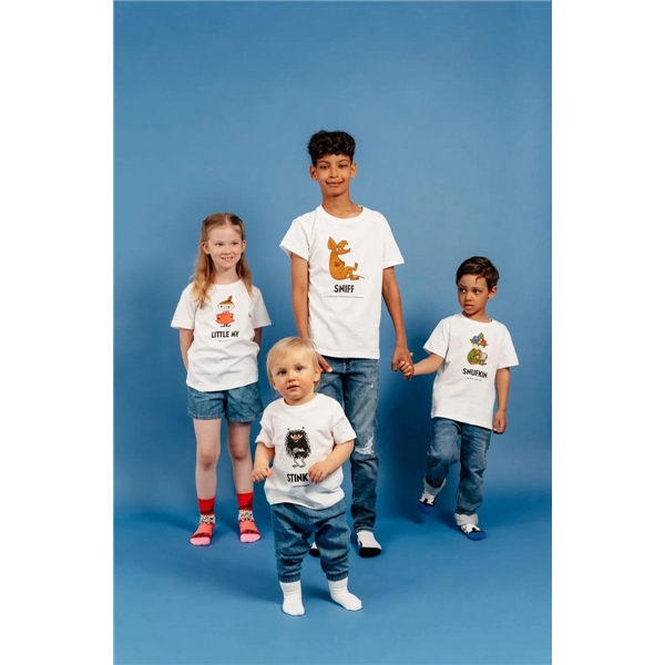 En fin Mumin t-shirt för barn. T-shirten är benvit, i rak modell med kort ärm och rund halsringning. I nacken finns frågan 'Which Moomin character are you?' och framtill finns det engelska namnet på favoritfiguren, tillsammans med en bild på den. Tillverkad i 100% bomull. Öko-tex.