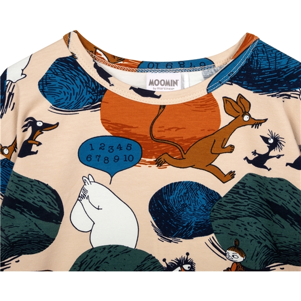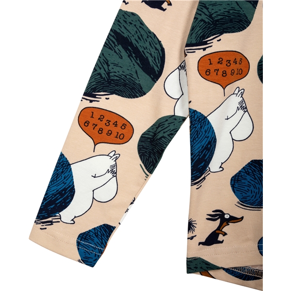 En långärmad tröja i beige, helmönstrad med muminfigurer som leker kurragömma och räknar till tio bland stora stenbumlingar. Modellen är lätt oversized med nedhasad axelsöm och fint rundad nederkant.