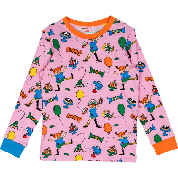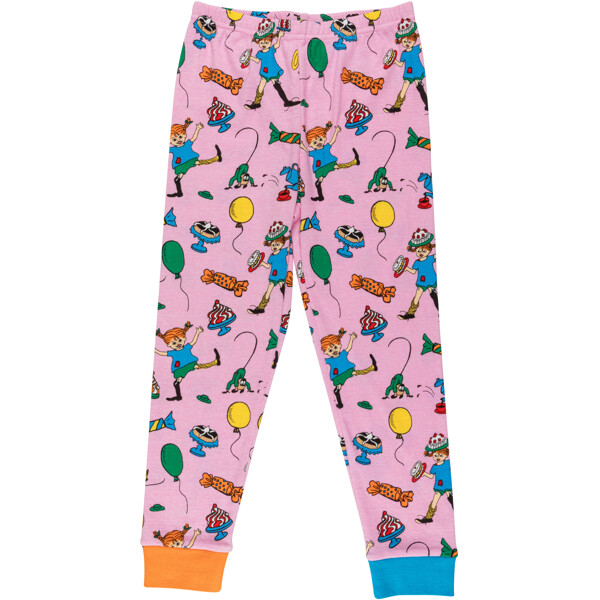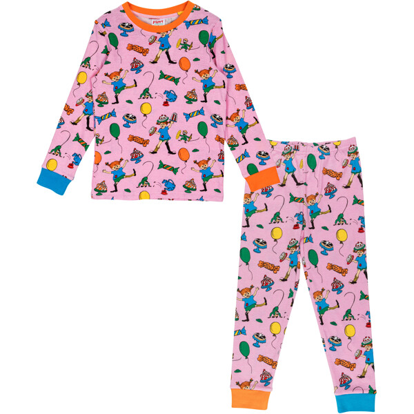 En tvådelad Pippi Långstrump-pyjamas för barn, i rosa med festligt helmönster och olikfärgade muddar i ärm- och benslut. Tröjan har lång ärm och rund halsringning. Byxan har infälld resår i midjan. Tillverkad i bomull.