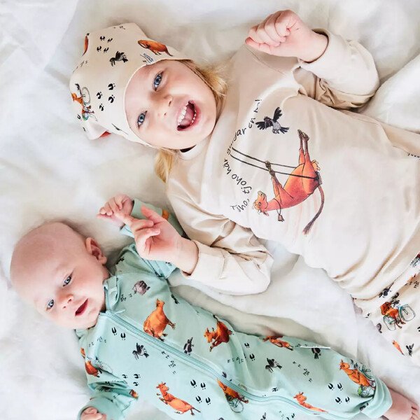 Tvådelad pyjamas med Mamma Mu i mjuk och skön ekologisk bomull. Pyjamasen består av ett par byxor med resår i midjan och breda muddar och en långärmad tröja även den med muddar.