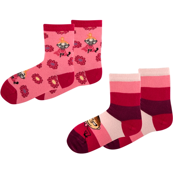 Mumin Strumpor 2-p Blomma Magenta är två par färgglada muminstrumpor. Ett par är randiga och ett par är blommiga i rosa toner.