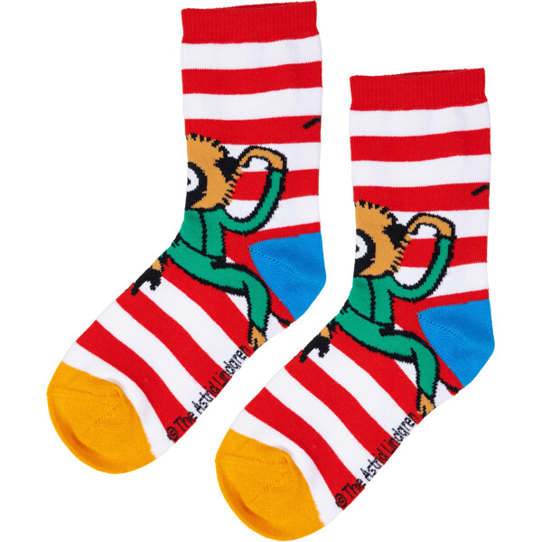 Glada Pippi strumpor för barn. Förpackningen innehåller två par strumpor. Det ena paret blått med stort Pippitryck, gula tår och röda hälar, det andra paret rödvitrandigt med Herr Nilsson, orange tår och blå hälar.