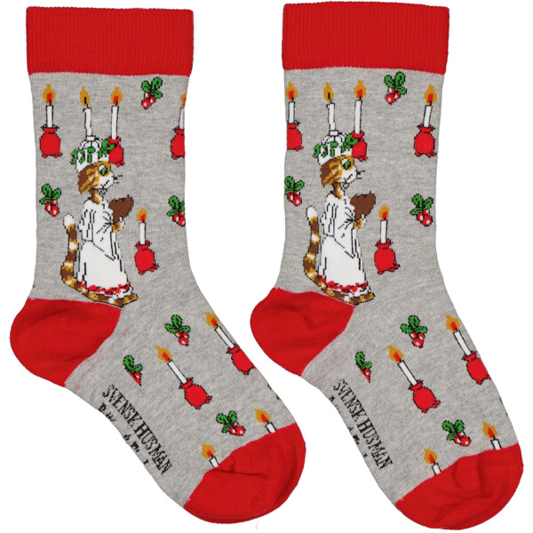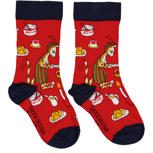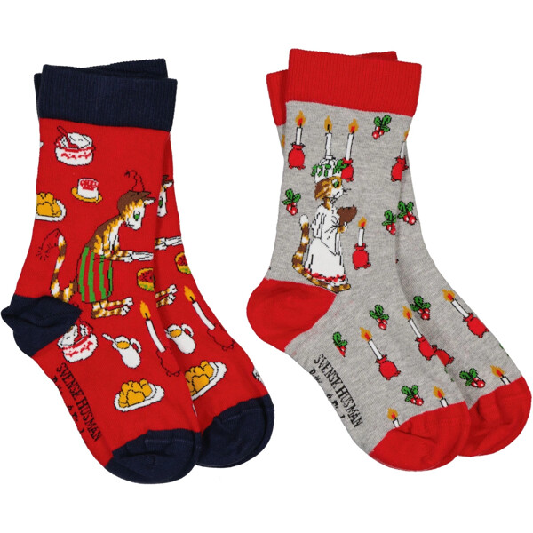 Gör väntan på julafton lite roligare med dessa färgglada barnstrumpor med motiv från älskade Pettson och Findus! I detta 2-pack får du två olika mönster – ett med Findus som som äter en massa julmat, och ett med Findus i som lucia.Håller färg och form även efter många äventyr i tvättmaskinen.