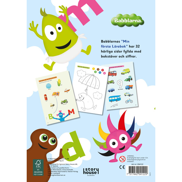 Babblarnas Min första lärabok har 32 härliga sidor fyllda med bokstäver och siffror.