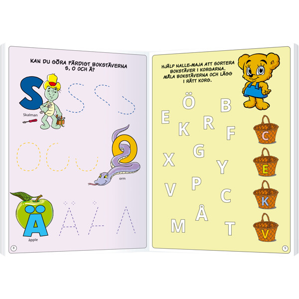Fyll i de streckade bokstäverna och siffrorna, lägg dem på rätt ställe, dra streck mellan olika saker och en massa andra övningar. Det finns även ett litet memo att klippa ut. Längst bak finns lösningarna.