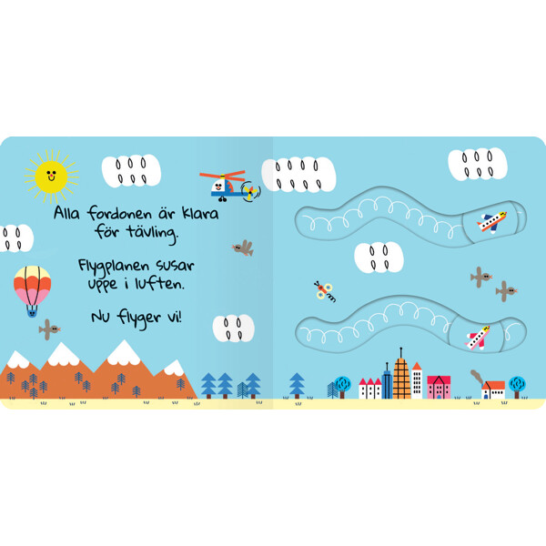 Klara, färdiga, kör! Om du lutar boken kan du följa när de färgglada fordonen kör över sidan. Vilket fordon vinner loppet?