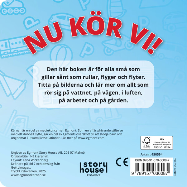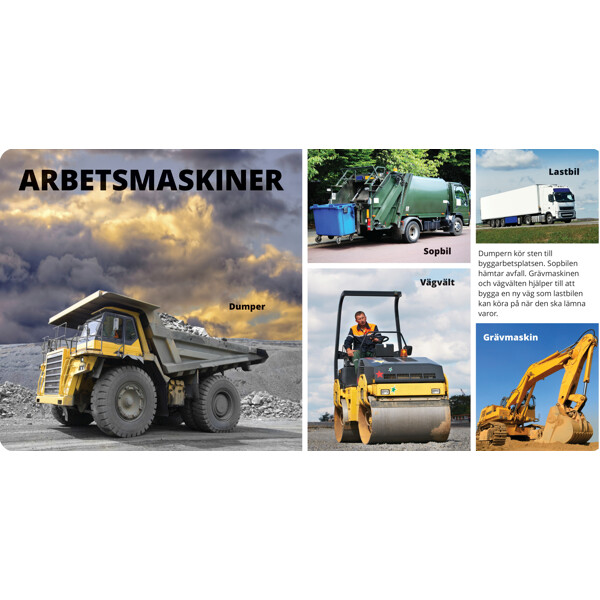 Den här boken är för alla små som gillar sånt som rullar, flyger och flyter.Titta på bilderna och lär mer om allt som rör sig på vattnet, på vägen, i luften, på arbetet och på gården.