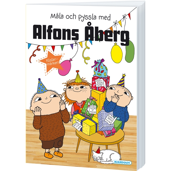 Alfons Åberg fyller år och han har kalas. Måla och pyssla med Alfons och hans vänner i den här fina boken. I boken finns massor av roliga och kluriga pyssel som att dra linjer till rätt saker, hitta rätt väg i labyrinten, lös bildkryss, finn fem fel, prick till prick och mycket mer. Det finns också många klistermärken i boken.