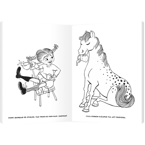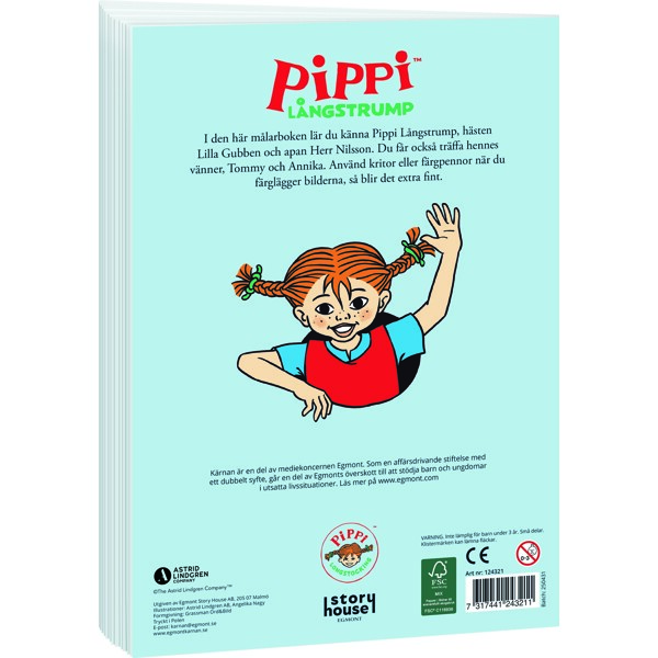 I den här målarboken lär du känna Pippi Långstrump, hästen Lilla Gubben och apan Herr Nilsson. Du får också träffa hennes vänner, Tommy och Annika.