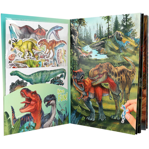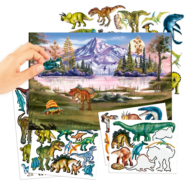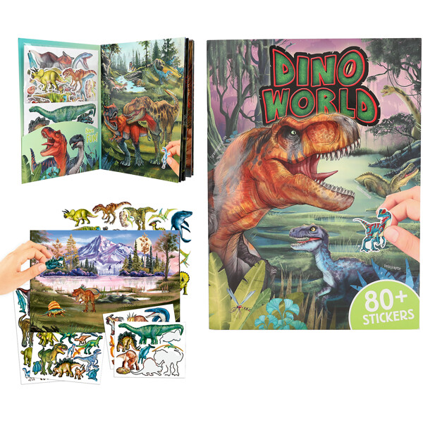 Dinotastisk pysselbok från Dino World med 84 häftiga dinosaurieklistermärken (4 ark med pappersklistermärken, 2 ark med Puffy-klistermärken i skum) som ger liv åt de 20 urtidsbakgrundssidorna.