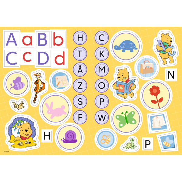 Boken innehåller många roliga och lärorika pyssel där Puh och hanns vänner lär dig alfabetets bokstäver. Uppgifterna är enkla och passar barn som precis börjat lära sig bokstäver.