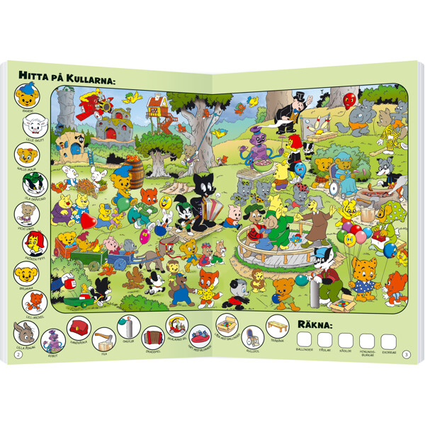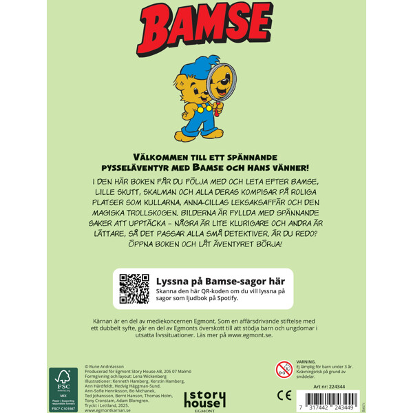 Följ med och leta efter Bamse, Lille Skutt, Skalman och alla deras kompisar på roliga platser som Kullarna, Anna-Cillas leksaksaffär och den magiska Trollskogen. BIlderna är fyllda med spännande saker att upptäcka - några är lite klurigare och andra är lättare, så det passar alla små detektiver.