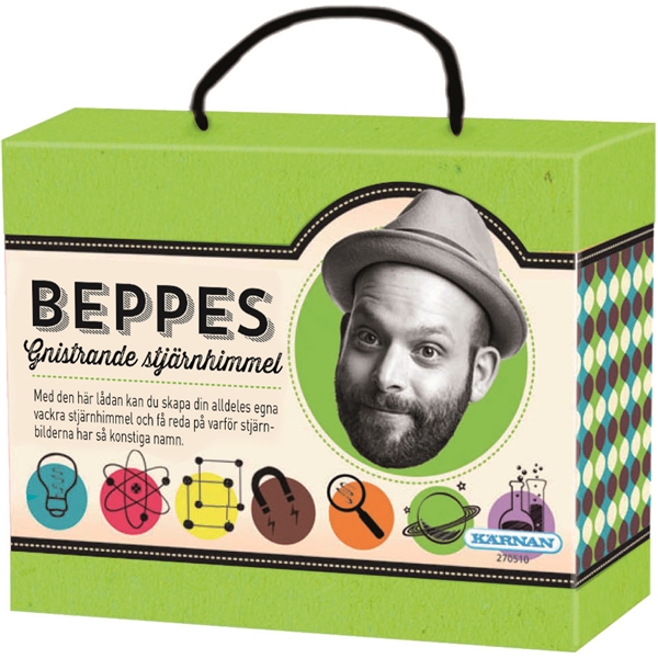Beppes Stjärnhimmel är en kul och smidig låda för alla oss som älskar stjärnor.Med Beppes gnistrande stjärnhimmel kan du skapa din alldeles egna vackra stjärnhimmel i ditt eget rum och få reda på varför stjärnbilderna har så konstiga namn. Till varje stjärnbild får du ett fint stjärnkort som hjälper dig att sätta upp stjärnorna på rätt sätt och som dessutom innehåller en massa spännande och kul fakta. Nu kör vi!Beppes Stjärnhimmel innehåller:FicklampaGummibandPapprullarAluminiumfolie, 11 st ark10 stjärnkort80 självlysande klistermärkenInstruktionshäfte