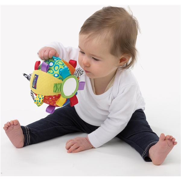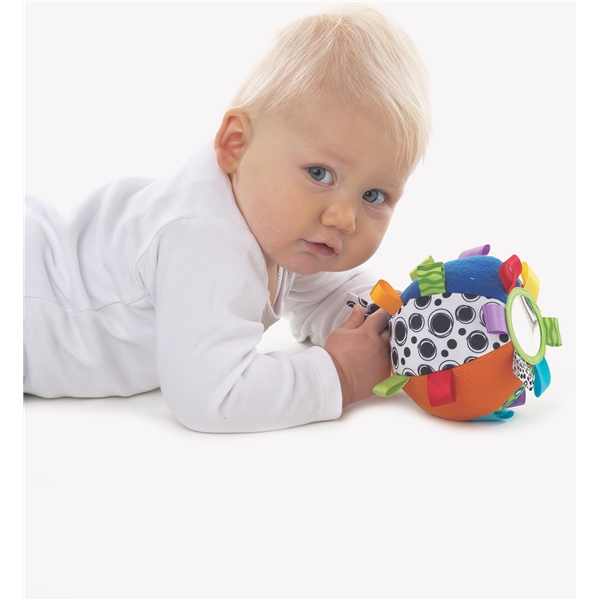 Playgro Mjuk Boll med Spegel är en färgglad mjuk boll i olika färger. Bollen har flera etiketter och en spegel, den är gjord i olika material i flera färger och mönster.