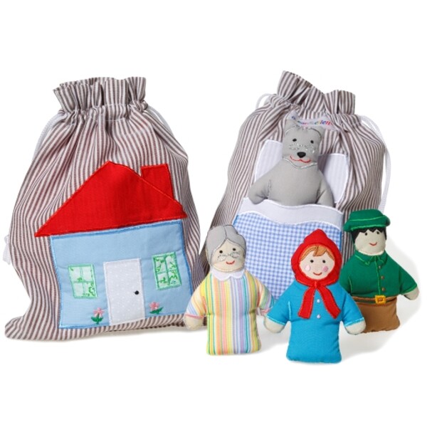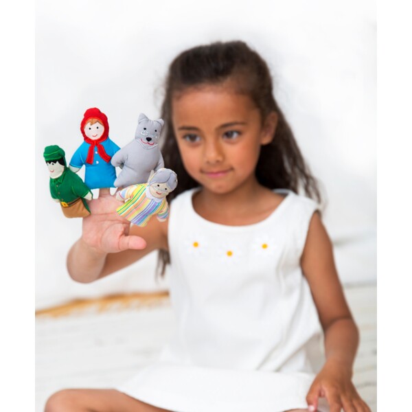 Fyra fingerdockor ingår -Rödluvan, varg, mormor och en jägare.