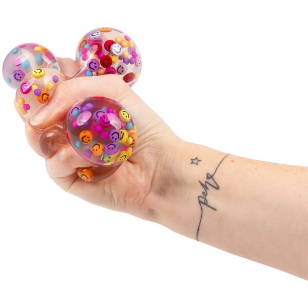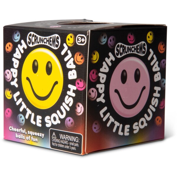 Vi återuppväcker glädjen från 90-talets smiley-mani med en färgstark och skojigt glad smiley-klämboll!