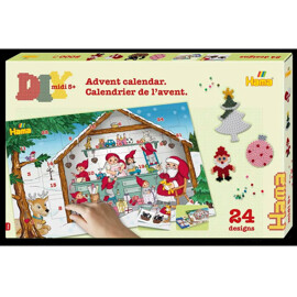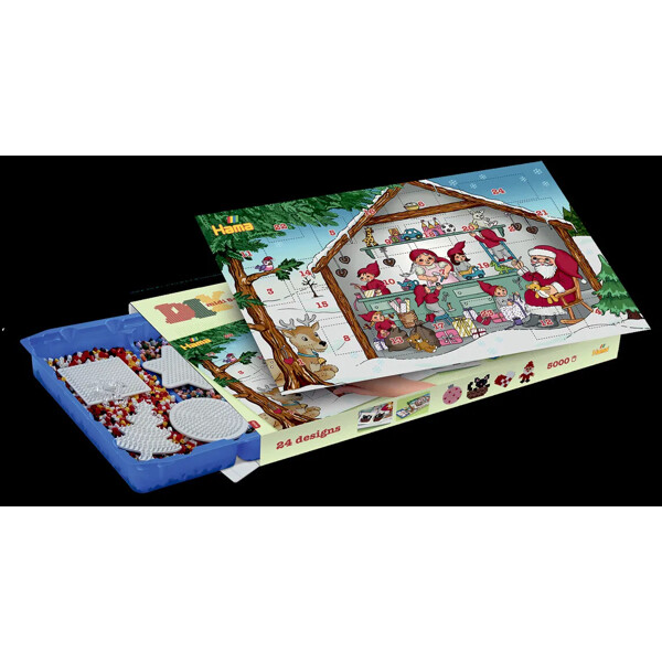 Adventskalender med cirka 5000 pärlor, 5 pärlplattor och 24 utskrivna motivark samt vägledning och strykpapper.