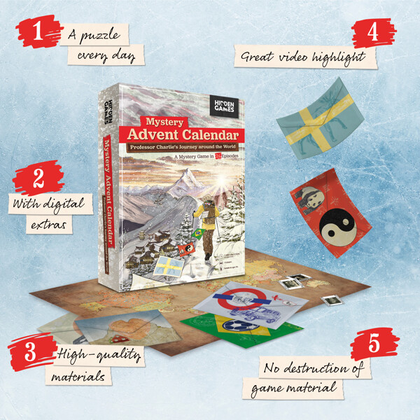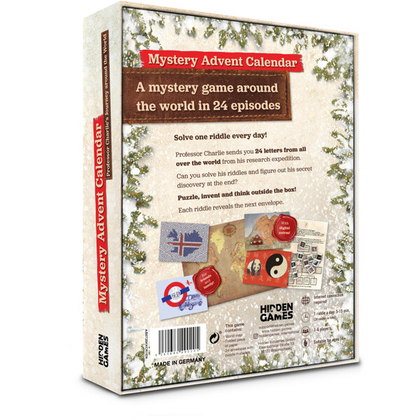 Denna spännande julkalender tar dig med på en mystisk resa i professor Charlies fotspår! Julkalendern innehåller 24 mystiska kuvert. Lös gåtorna och upptäck hans hemliga upptäckt!