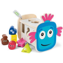 Babblarna Plocklåda Trä är en rolig leksak som funnit i flera år och som fortfarande är lika populär. Plocklådan låter barnet öva och utforska sin motorik. Babblarnas bästa vän roboten Klonk, lockar till lek med sina glada färger och former. De sex klossarna har olika geometriska former och de är lätta för barnet att lära sig. Vilken av klossarna passar i vilket hål? Plocklådans botten är klädd med filt för att ge ett behagligt ljud när klossarna släpps ner.