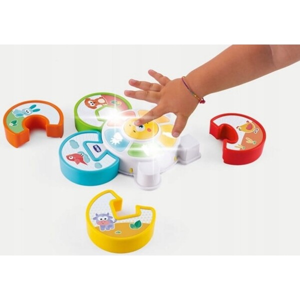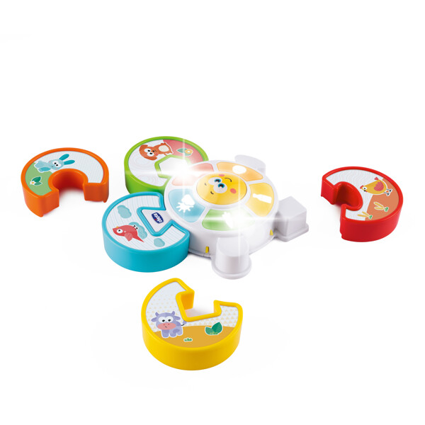 Tryck på ansiktet i mitten för att spela och aktivera ljussekvensen tillsammans med en rolig melodi ... När sekvensen stannar vid ett ljus, matcha djuret på pusselbiten med det upplysta elementet.