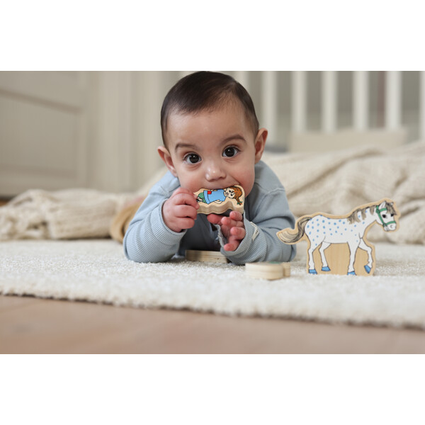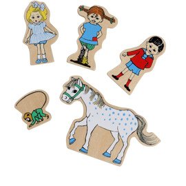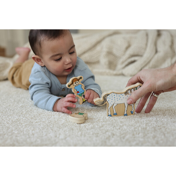 Med fem träfigurer Pippi, Tommy, Annika, Lilla Gubben och Herr Nilsson kan barnet skapa egna små äventyr. Figurerna är enkla att greppa och kan följa med överallt. Perfekta för små barn som precis börjat leka med karaktärer och hitta på egna berättelser.