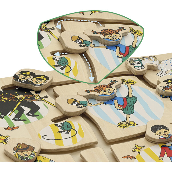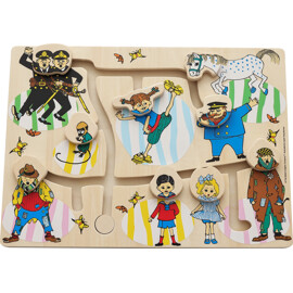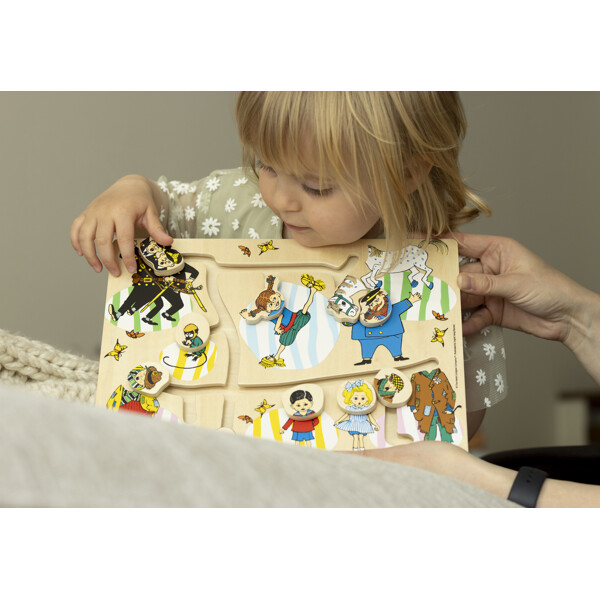 Här ska ni flytta runt nio olika huvudklossar i banan och hitta rätt kropp. Men det gör inget om det blir fel det är minst lika kul att skapa tokiga figurer och hitta på egna varianter. Pusslet är i trä och bjuder på lekfullt tänkande, skratt och kreativitet. Ett perfekt pussel för dom lite mindre barnen som gillar att testa, matcha och hitta nya sätt att leka tillsammans.