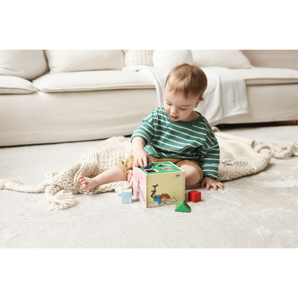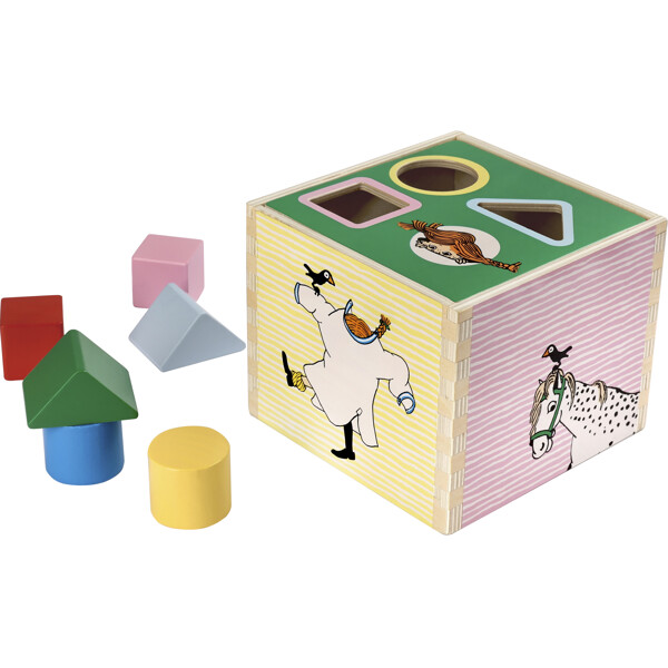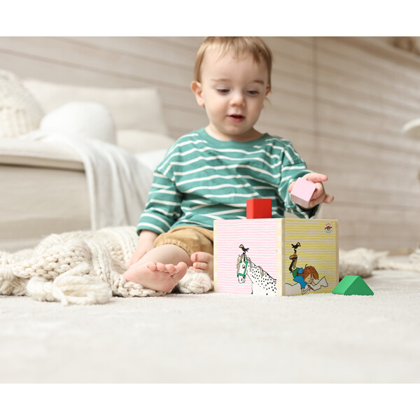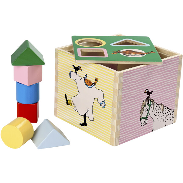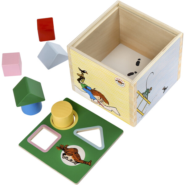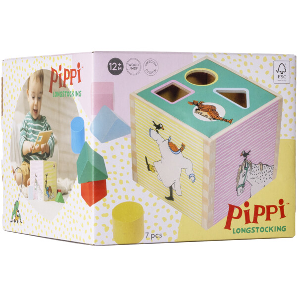 Med plocklådans sex klossar i olika former och färger får barnet utforska, prova och upptäcka. På locket kikar Pippi fram och när klossarna är på plats är det bara att lyfta av locket så att barnen kan plocka i och ur på ett enkelt sätt. En rolig babyleksak i trä som hjälper barnet att förstå form och färg. Perfekt för små barn som vill lära genom att leka!