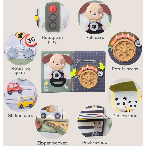 Gör bilresan till ett spännande äventyr för ditt barn!Med Taf Toys Quiet Ride Book blir varje resa en stund av lek och lärande. Den här smarta aktivitetsboken är perfekt för småbarn mellan 1–3 år och fästs enkelt och säkert på bilens nackstöd.Boken är full av roliga överraskningar, olika texturer att känna på, prassliga tyger, pop-it i silikon, titt-ut-flikar och små bilar som går att flytta – allt inom räckhåll för bakåtvända barn.Designad med inspiration från Montessori-pedagogiken uppmuntrar den skärmfri underhållning och stimulerar barnets nyfikenhet och utveckling. Slipp gnälliga bilresor och skapa istället lugna, fokuserade stunder fyllda med upptäckarglädje!