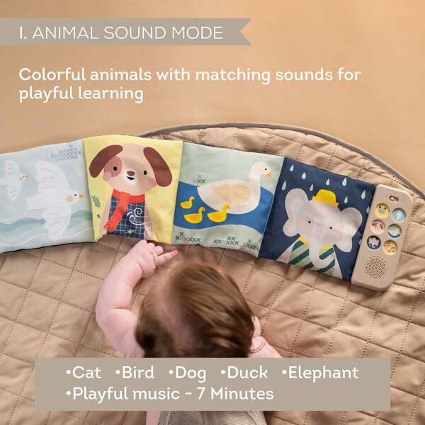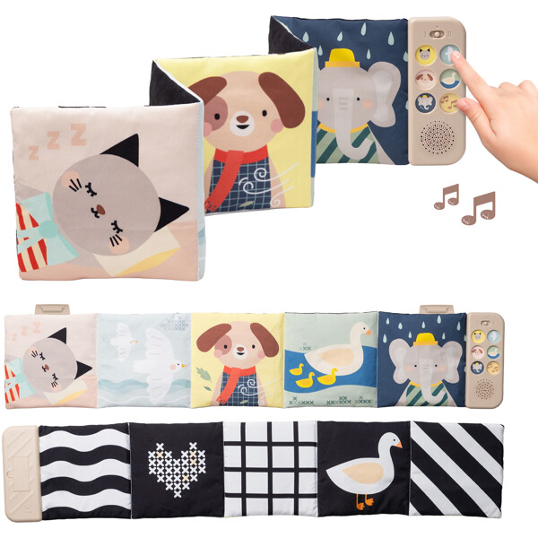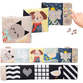 Lugna och engagera ditt barn – var du än är!Taf Toys Newborn Soothing Book är den ultimata sensoriska ljudboken för spädbarn. Med 5 lugnande djurljud, 5 avslappnande naturmelodier och mjuka vaggvisor skapar den en fridfull miljö under magträning, lek i spjälsängen eller promenader i vagnen.