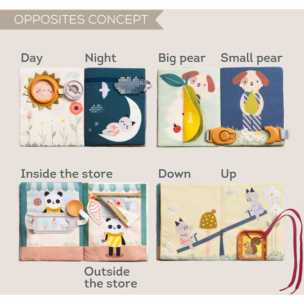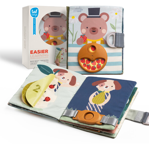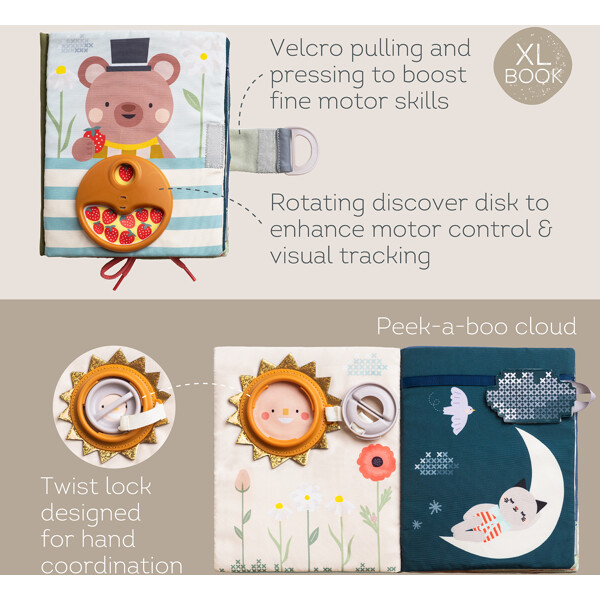 En lekfull och påhittig mjuk bok designad för barn från 18 månader och uppåt. Med tolv olika aktiviteter som dragkedjor, spännen, snören och tittut förbättrar boken utvecklingen av motoriska färdigheter och introducerar förmågor som att klä på sig och spänna fast sig.I boken finns också siffror för att främja tidiga matematiska färdigheter. Tillverkad i säkra och hållbara material.