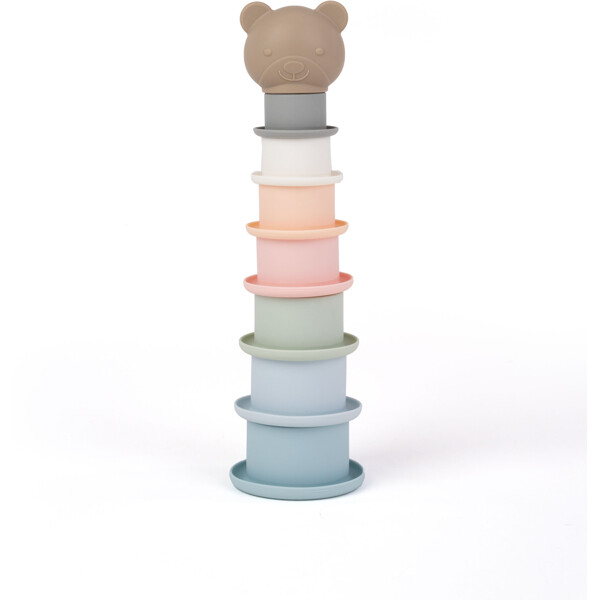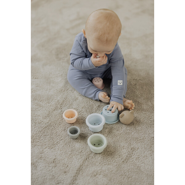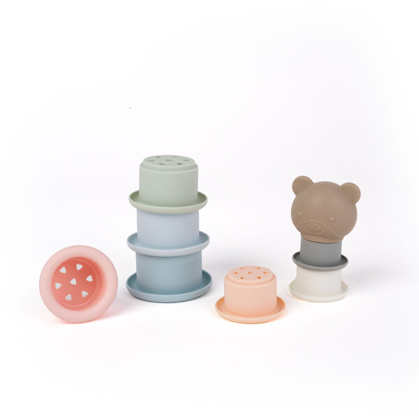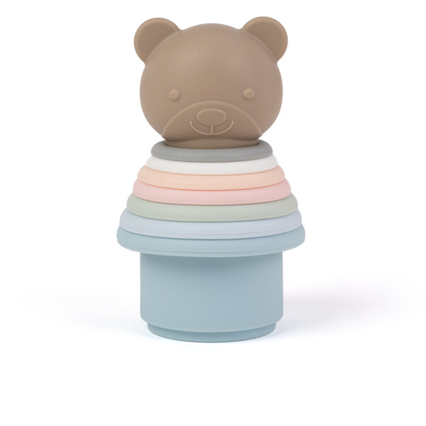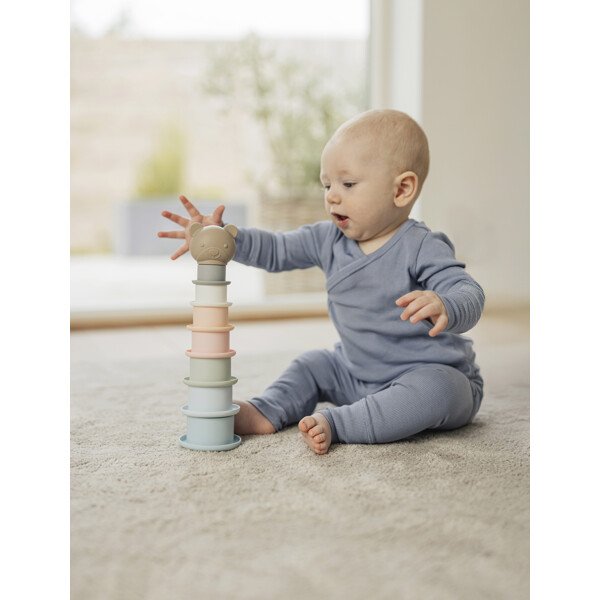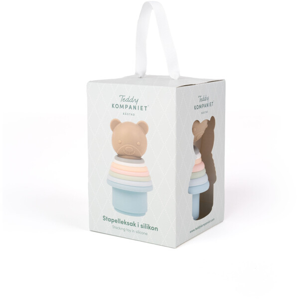 En mångsidig stapelleksak i silikon med nallemotiv som stimulerar barnets finmotorik och fantasi. De olika delarna kan staplas, byggas till torn eller användas som badleksaker.Tillverkad i silikon, helt fri från BPA, BPS och PVC. Enkel att rengöra och säker för små händer och munnar. En uppskattad gåva till nyfödda, till dop och babyshowers.
