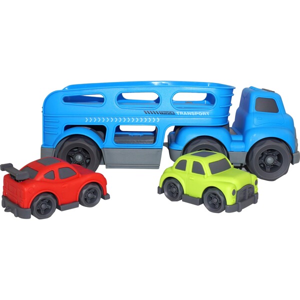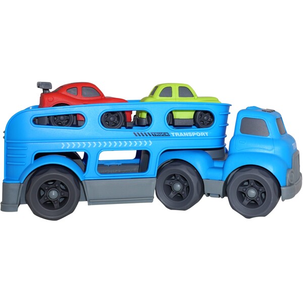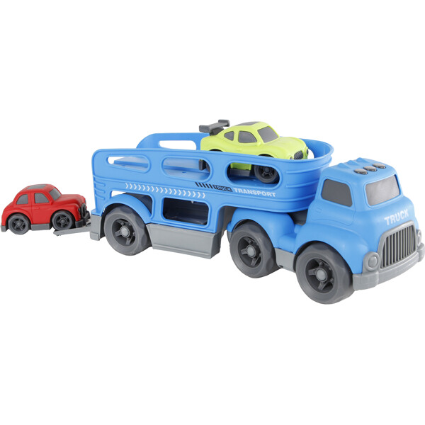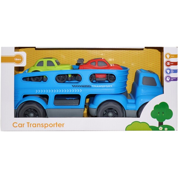 Den här biltransporteren tar dina bilar runt i huset! Med 6 hjul och 2 nivåer kommer du alltid ta bilarna till deras destination med stil. Lasta de två medföljande bilarna i vardagsrummet, kör dem till köket och fäll ner rampen och rulla iväg! Uppmuntrar till barnets utveckling av motoriska färdigheter och fantasifulla och kreativa lekar.