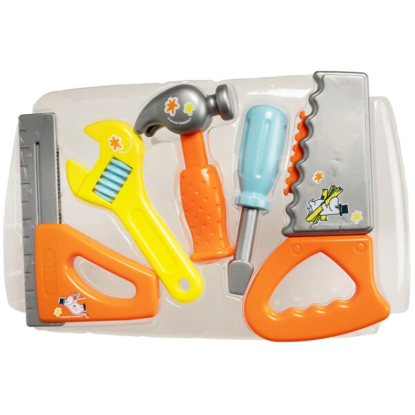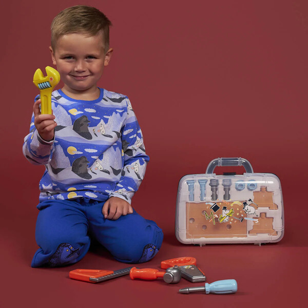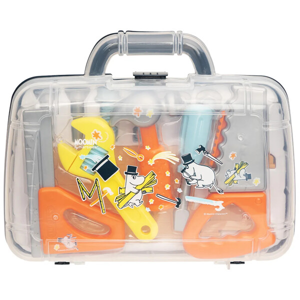 Den innehåller såg, skruvmejsel, hammare, mått och skiftnyckel, samt arbetsbänk med hål, muttrar och skruvar. Verktygens storlek är perfekt för barn och de är hållbara och trygga att leka med. Verktygen och lådan har roliga bilder av Muminpappan som snickrar och grejar.