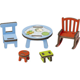 Fikadags hemma hos Bamses farmor! Det här tillbehörssetet till Bamsebyn innehåller ett bord med tryckt duk, två stolar och två pallar. Med det här setet kan barnet bjuda på fika uppe på Höga Berget!