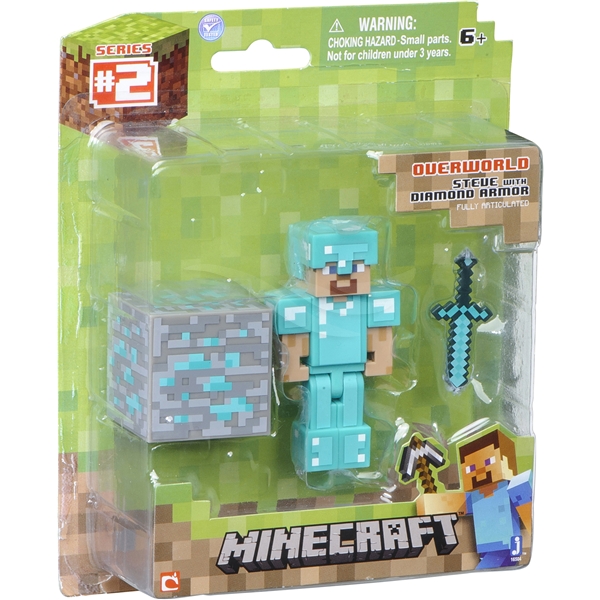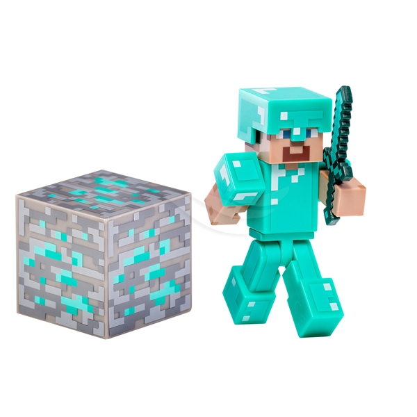 Minecraft Steve with diamond armor är Steve i diamantutgåva från det omåttligt populära spelet MINECRAFT. Skydda din MINECRAFT-värld från zombies och Creepers med den här Steve-figuren i diamantutrustning. Minecraft Steve with diamond armor innehåller 1 järnblock, 1 diamantsvärd och 1 löstagbar hjälm.