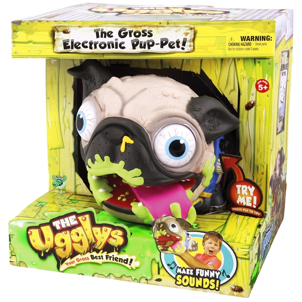 THE UGGLYS bulldogg är en äcklig men älskvärd liten byracka. Den här äckliga lilla handdockan kommer att bli barnets nya bästa vän. Trä Uggly över handen och rör den på olika sätt för att skapa olika ljud. Uggly rapar, fiser, surrar och gör fula miner. Välj mellan bulldogg och sankt bernhardshund.