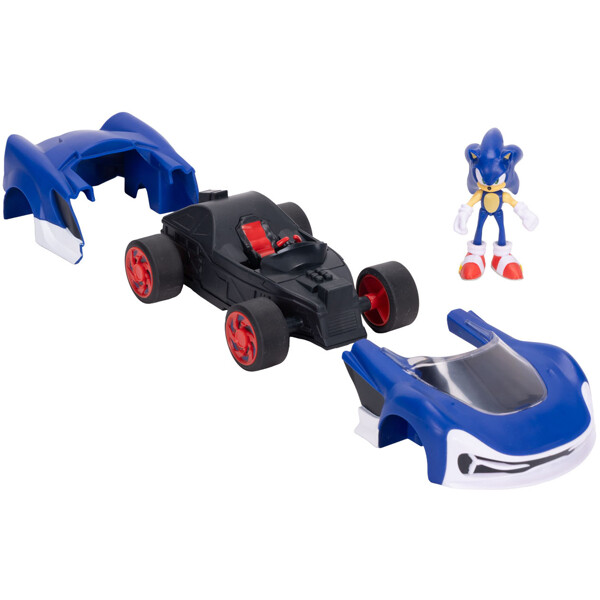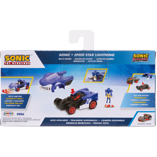Detta set innehåller en 6 cm Sonic-figur och en anpassad Rev-it Racer inspirerad av Sonic Racing: CrossWorlds. Placera helt enkelt fordonet på en plan yta, varva det framåt och släpp för att se Sonic tävla - inga batterier behövs. De fritt rullande hjulen garanterar snabb och smidig racing, vilket gör den perfekt för att återskapa spännande tävlingar och rivaliteter från Sonic-universumet.