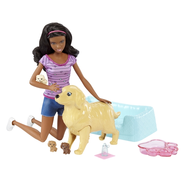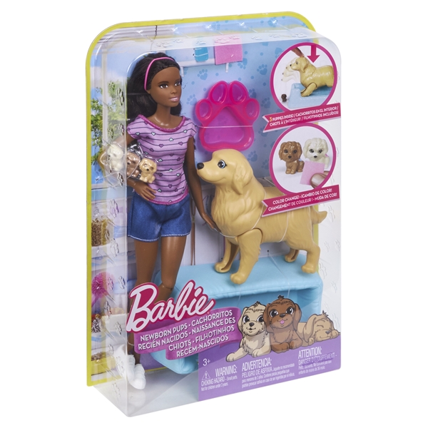 Barbie Brunett Nyfödda Valpar - Barbie® älskar djur, och nu kan hon hjälpa sin hund att få nya valpar till världen. Hjälp Barbie® att förlösa dem genom att trycka på tikens huvud. Tryck två gånger till för att välkomna de tre valparna! Varje valp har en egen färgsättning. Använd handduken för att applicera kallt vatten över valparna. Detta kommer att öppna deras ögon och visa ett färgat hjärta. Är det en pojke eller flicka?Barbie® dockans böjbara knän hjälper henne att välkomna och ta hand om de nya valparna, och tillbehören inspirerar till fantasi. Tikens bädd kan användas som valpbädd, en tassformad bricka är perfekt för bad och en vattenflaska hjälper till att rengöra de små valparna.Barbie® är klädd i en färgstark topp med grafiskt tryck, denim shorts, ett matchande hårband och vita sneakers. Innehåll: Barbie® docka med modeaccessoarer, tik, tre valpar, hundsäng, tassformad bricka, filt och flaska. Dockan kan inte stå upp.