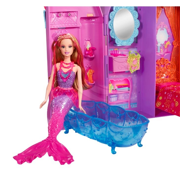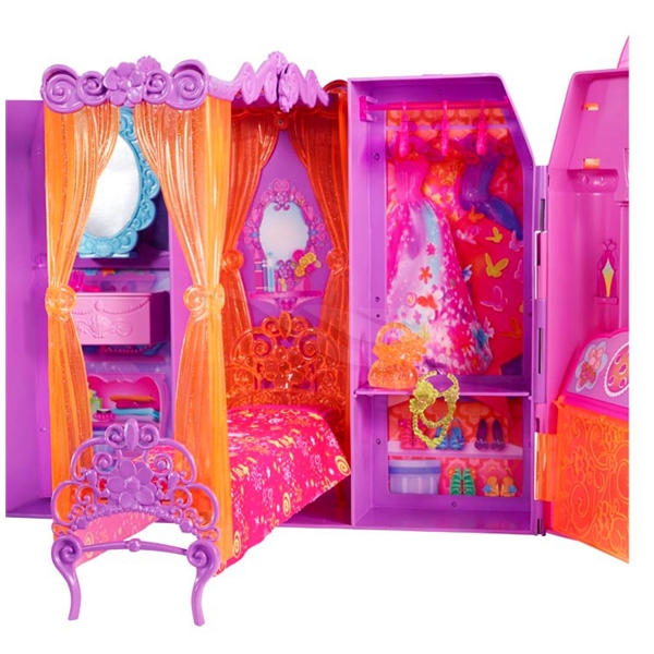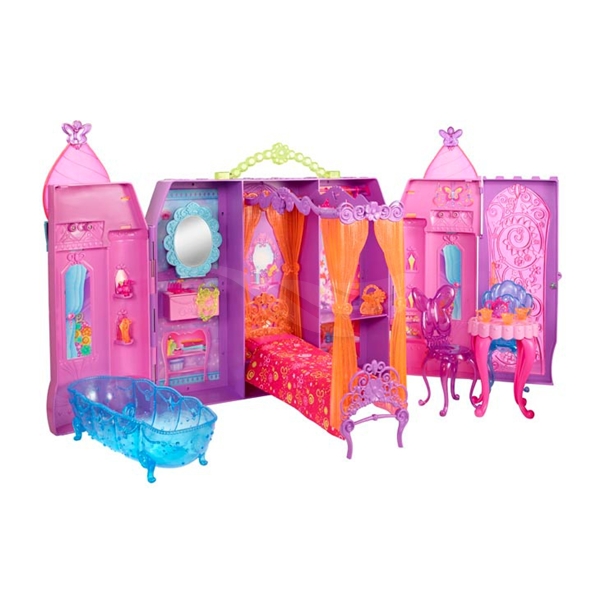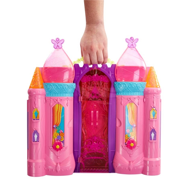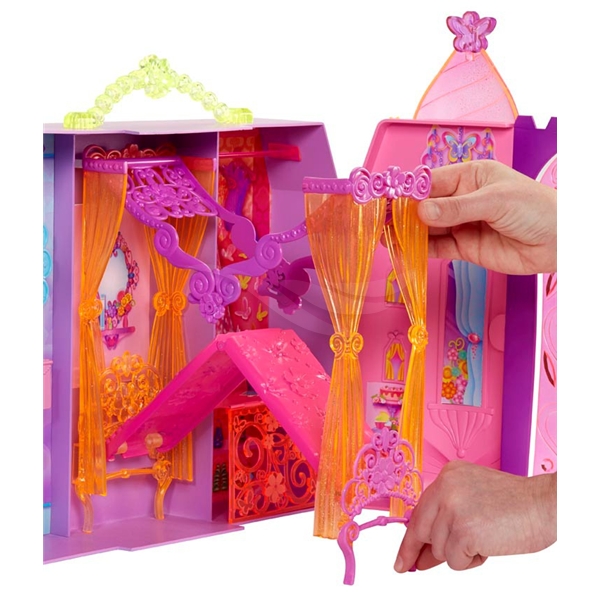 BARBIE Hemliga dörren, lekset är ett jättekul lekset baserat på den kommande filmen, Barbie och den hemliga dörren. I filmen ”Barbie och den hemliga dörren” hamnar prinsessan Alexa i en magisk och färgstark värld full av fantastiska karaktärer. Med det här slottet kan du återskapa dina favoritscener från filmen och hitta på nya magiska äventyr. När slottet öppnas innehåller det tre rum: du kan dricka te i matsalen, välja en klänning till balen i garderoben eller ta ett bad i badkaret. Slottet kan fällas ihop för enkel transport och förvaring. Barbie Hemliga dörren Lekset har praktiska handtag.