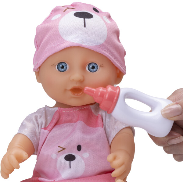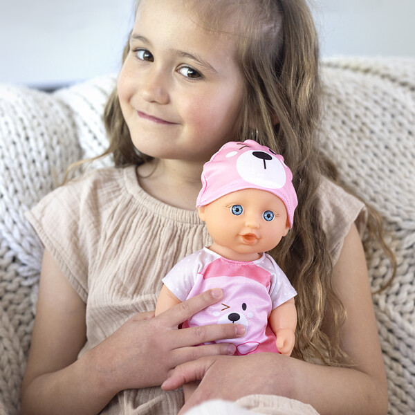 Babydockan Ella är en liten docka som älskar att vara nära och bli ompysslad. Setet innehåller en docka, skallra, potta, matskål, nappflaska och två skedar. Dockan är 28 cm lång.