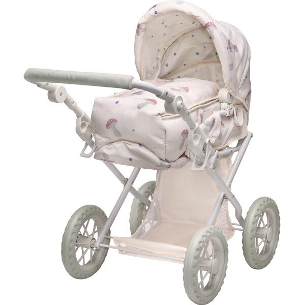 Dockvagnen har en urtagbar, mjuk docklift med handtag. Vagnens handtag är justerbart så det passar barn i olika åldrar och längd. Den rosa klädseln är avtagbar och pryds av handritade illustrationer av blåbär och svampar - en unik design skapad i Sverige. Den har dessutom en fällbar sufflett, en praktisk shoppingkorg och ett ramverk som går att fälla ihop vid transport.