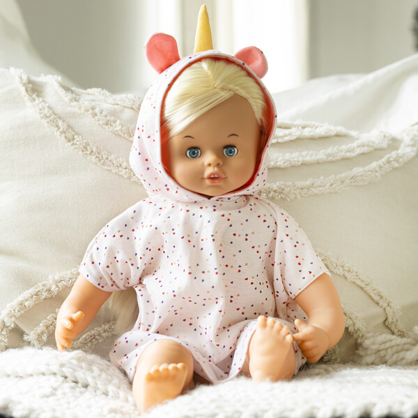 Badrocken har fina, sydda detaljer med enhörningshorn på. Dockkläderna är lätta att ta av och på för ombyten och nya äventyr. Vad ska dockan och barnet hitta på idag? Låt barnets fantasi visa vägen!
