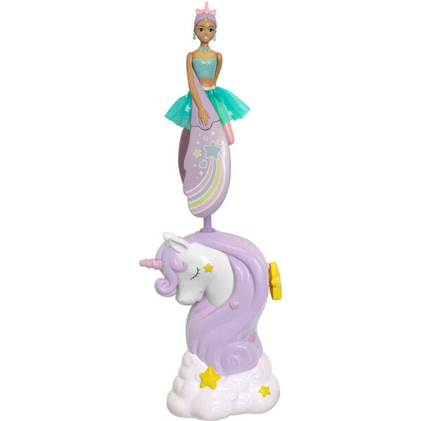 Placera henne på den magiska enhörningsstartaren, dra i snöret… och se henne snurra och sväva genom luften som ren magi! Inga batterier behövs – magin börjar med dig.